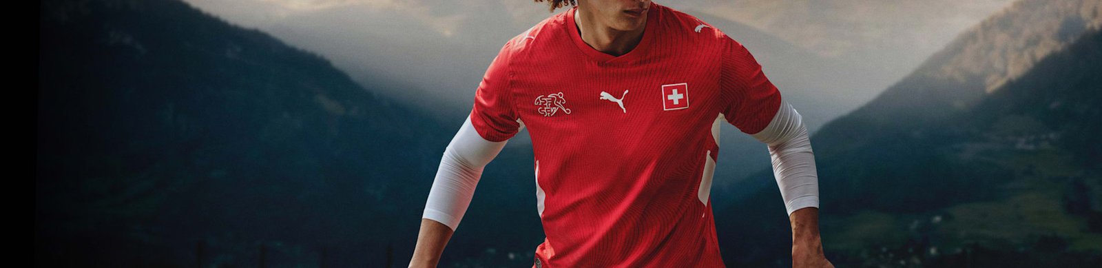 Official Puma product copy says the home shirt is inspired by Switzerland's futuristic passports and designed with Swiss precision.